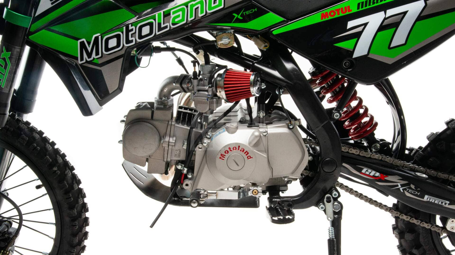 С весом всего 75 кг и грузоподъёмностью до 90 кг, питбайк оснащён стальной рамой и металлическими колесами с прочными спицами. Дисковые тормоза с двухпоршневым суппортом спереди и однопоршневым сзади гарантируют надёжность и безопасность.